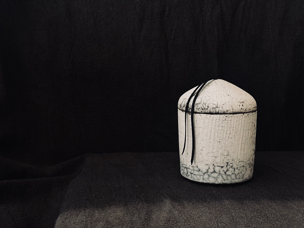 Beautiful wheel-thrown container, shaped by hand and finished with smoke and fire to create a quietly striking object of beauty. The surface remains raw and textured, celebrating the tactility of stoneware, then carefully sealed for durability.